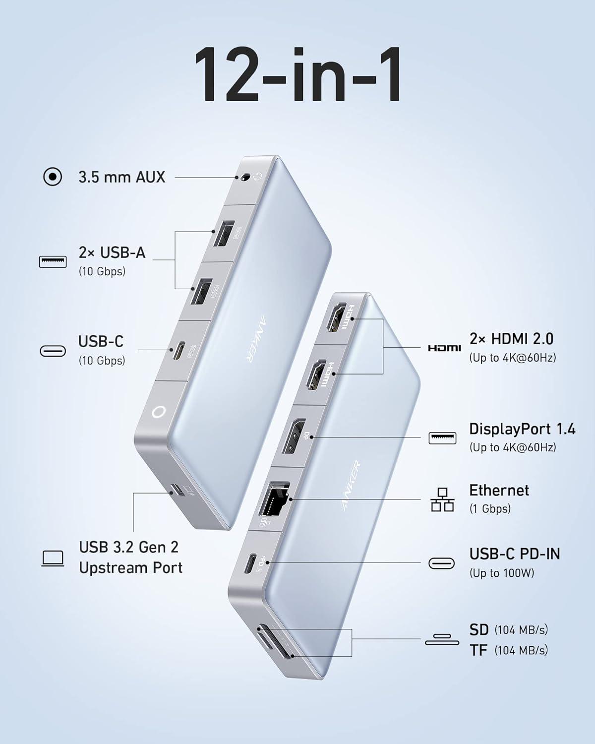 Enormous 12-Port Expansion: Equipped with a USB 3.2 Gen 2 Upstream Port (USB-C 10 Gbps), 2× USB-A (10 Gbps), 2× HDMI 2.0 (Up to 4K@60Hz), a DisplayPort 1.4 (Up to 4K@60Hz), an Ethernet port (1 Gbps), SD (104 MB/s) TF (104 MB/s), and 3.5 mm AUX.