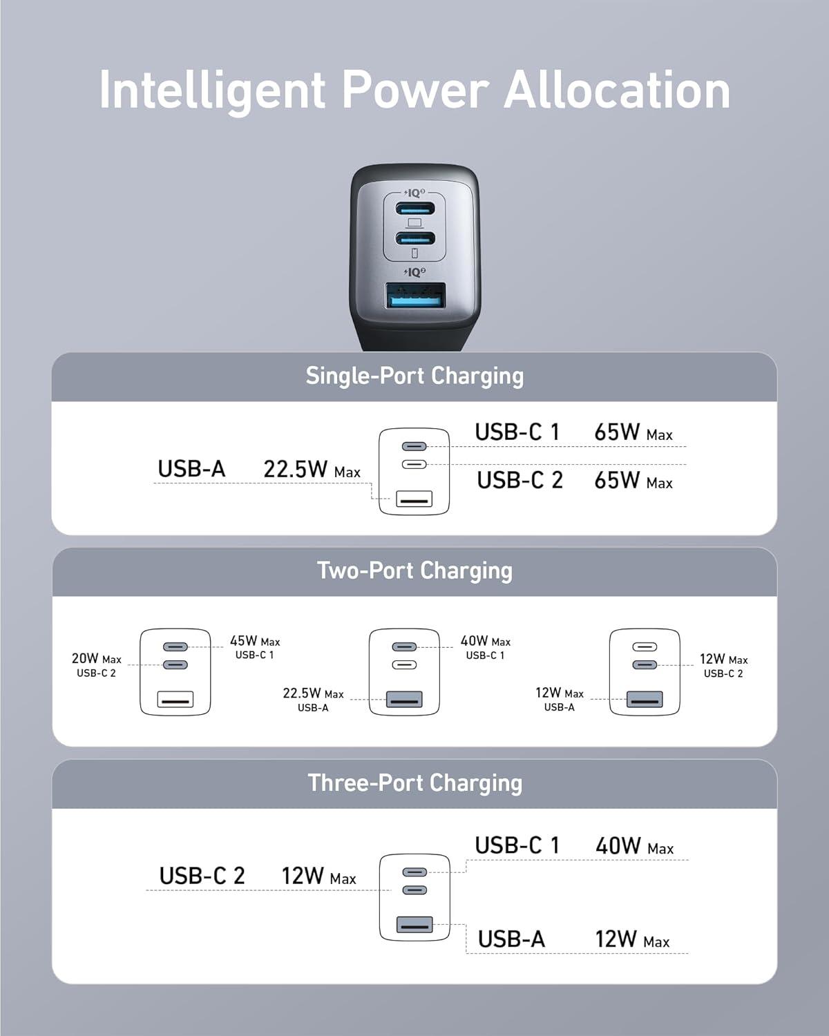 High-Speed Charging: Connect a single device to get a 65W max charge—that’s enough to power up a 2020 MacBook Pro 13″ at full speed. And when you connect three devices, power will be distributed efficiently between ports to ensure you get the best charge.