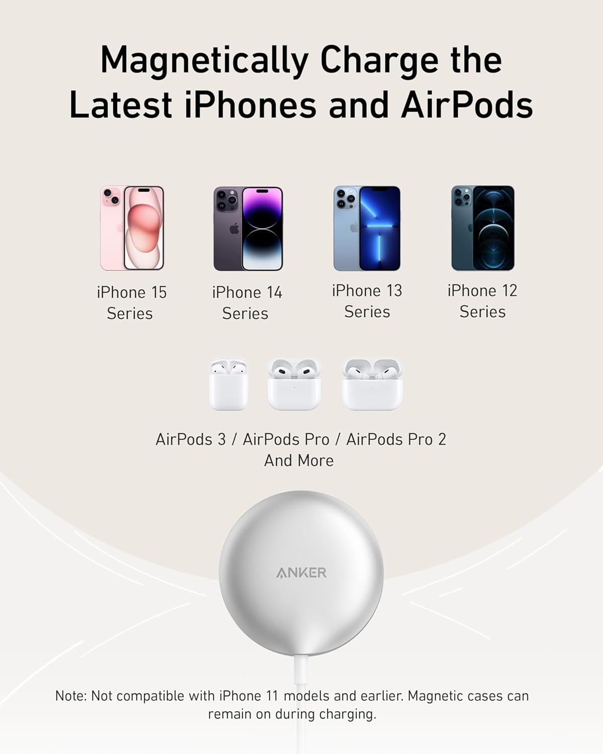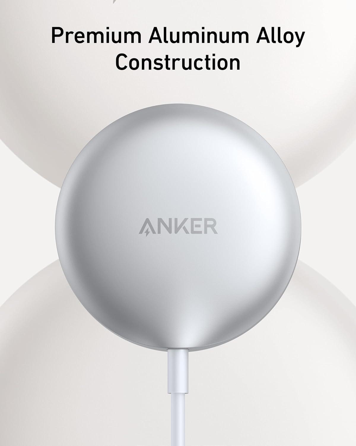 Anker MagSafe Charger Pad, MagGo iPhone 16 Wireless Charging Pad, Qi2 Certified 15W Wireless Charger, Compatible with iPhone 16/16 Plus/16 Pro/16 Pro Max/15/14/13/12 Series (Black, with Adapter)(White)