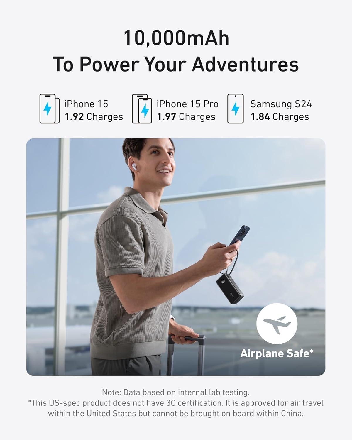 Anker Nano 3-in-1 Portable iPhone Charger, 10,000mAh Power Bank with Built-in USB-C Cable and Foldable Wall Plug, 30W Max Battery Pack, Travel Essentials for iPhone 16/15 Series, Galaxy, MacBook