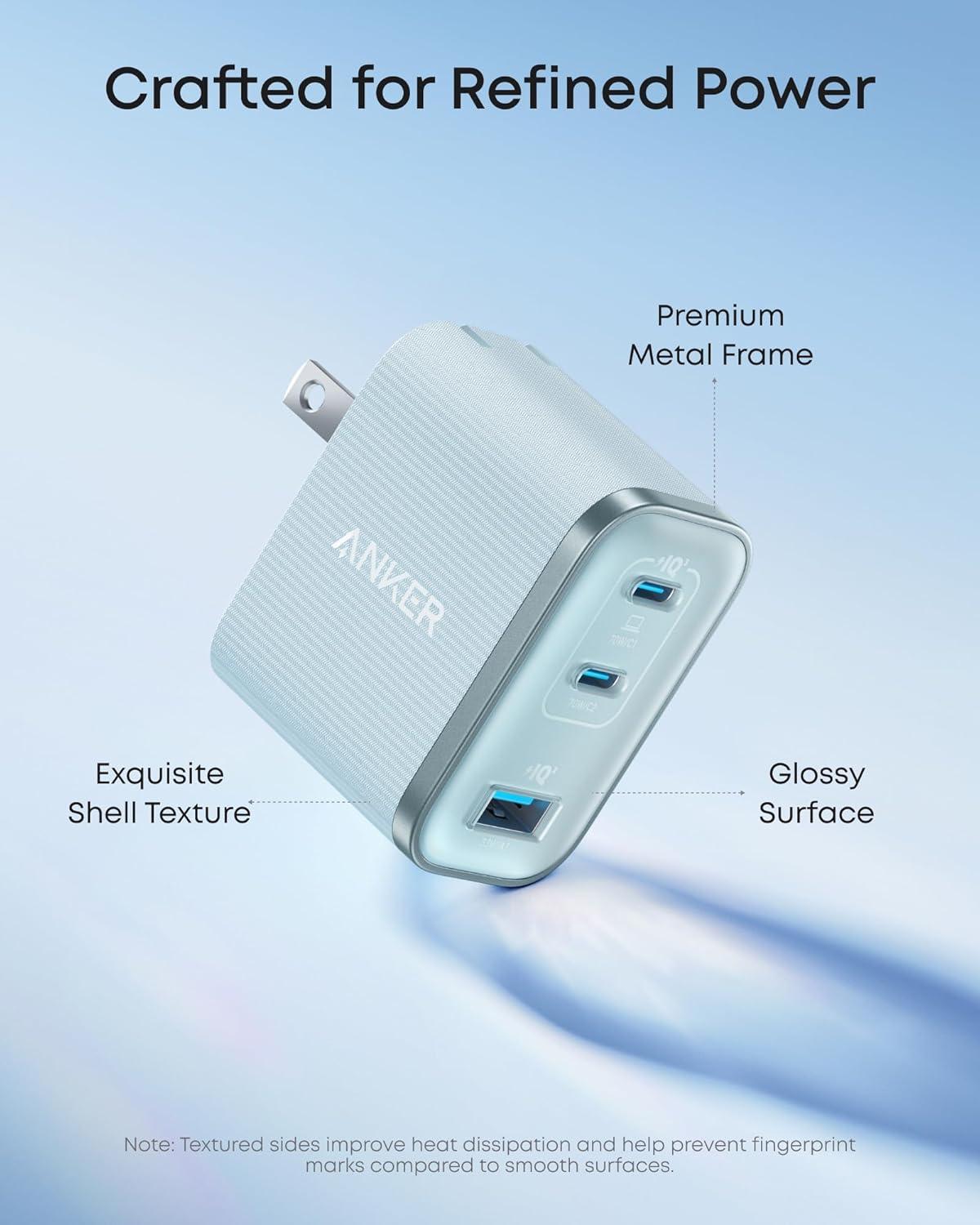 Anker Nano Charger, Ultra-Fast 70W Output 3-Port USB C Charger Block, Fast Charging, Compact and Stylish, for iPhone 17/16 Series, MacBook, iPad, Pixel, Galaxy, and More(Black, Cable Included)(Blue)