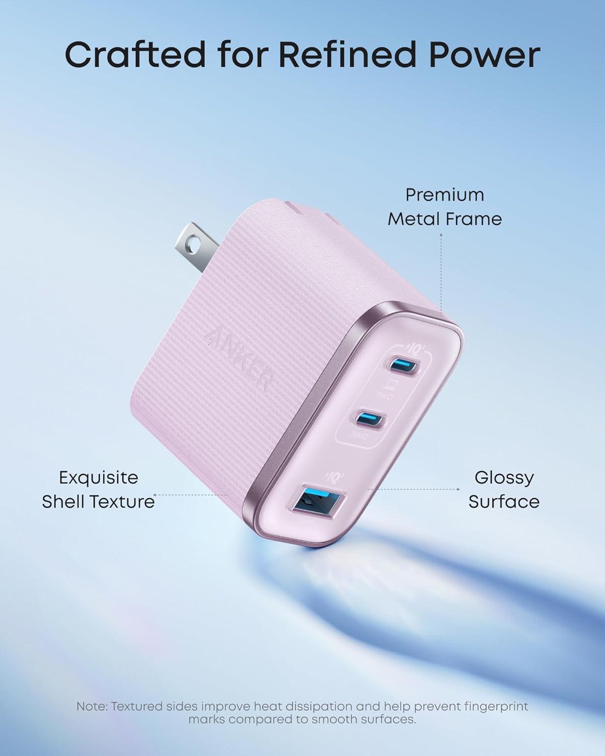 Anker Nano Charger, Ultra-Fast 70W Output 3-Port USB C Charger Block, Fast Charging, Compact and Stylish, for iPhone 17/16 Series, MacBook, iPad, Pixel, Galaxy, and More(Black, Cable Included)(Pink)