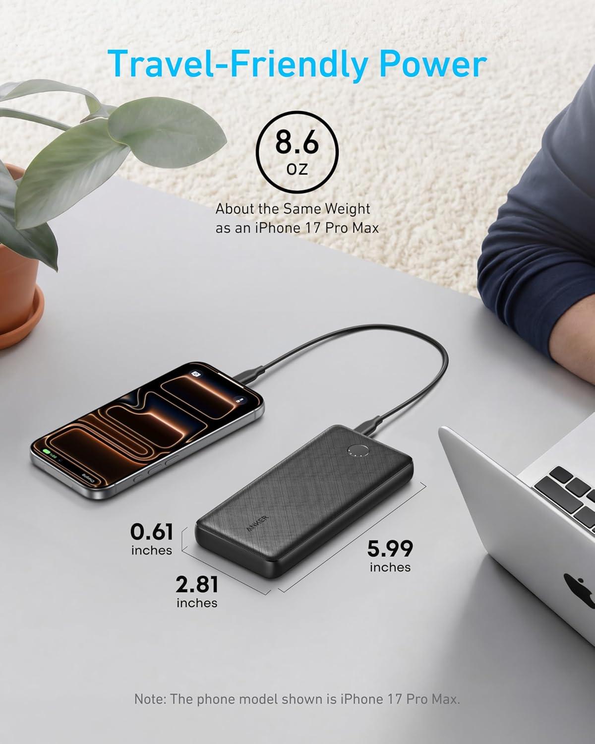 Slim Size, Big Power: One of the slimmest and lightest 10,000mAh portable chargers on the market. Provides 2 charges for iPhone 15, 1.93 charges for Galaxy S23, and 1.23 charges for iPad mini 6.