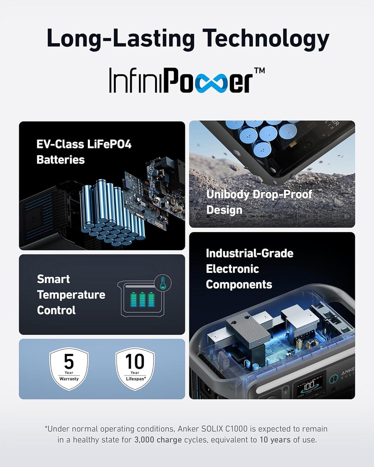 10-Year Lifespan, 3,000 Battery Cycles: Anker SOLIX C1000 is built to last with over 3,000 battery cycles. So power up, day after day, for 10 years.