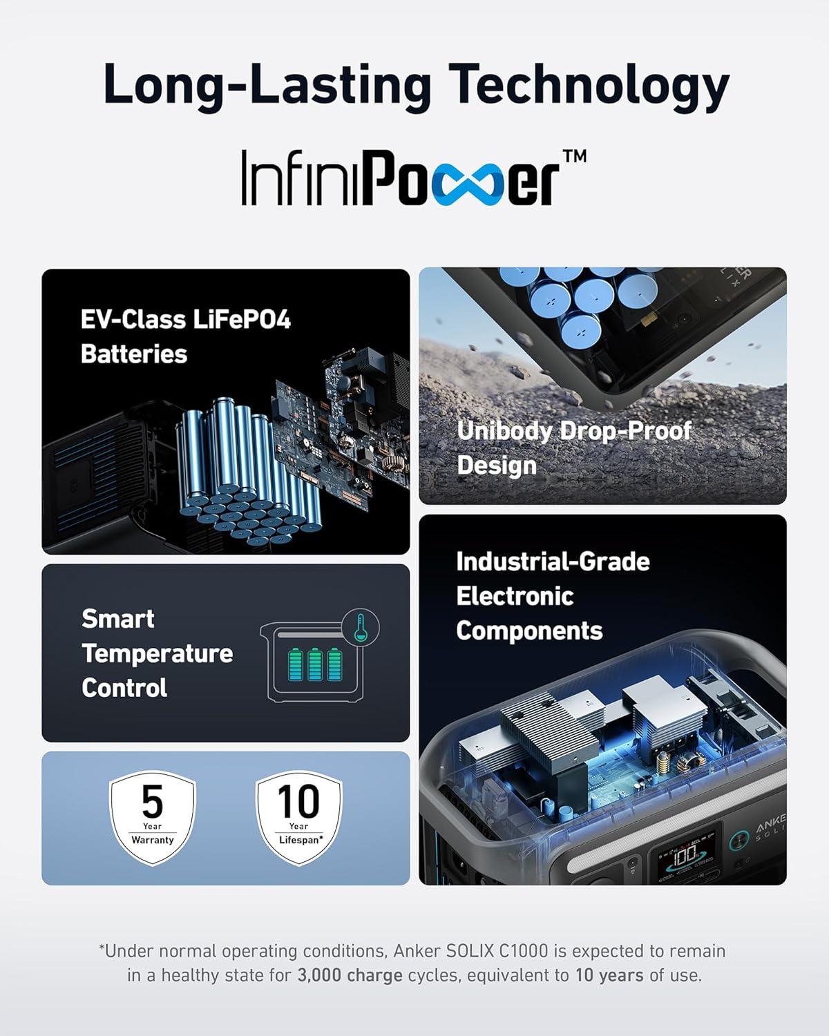 10-Year Lifespan, 3,000 Battery Cycles: Anker SOLIX C1000 is built to last with over 3,000 battery cycles. So power up, day after day, for 10 years.