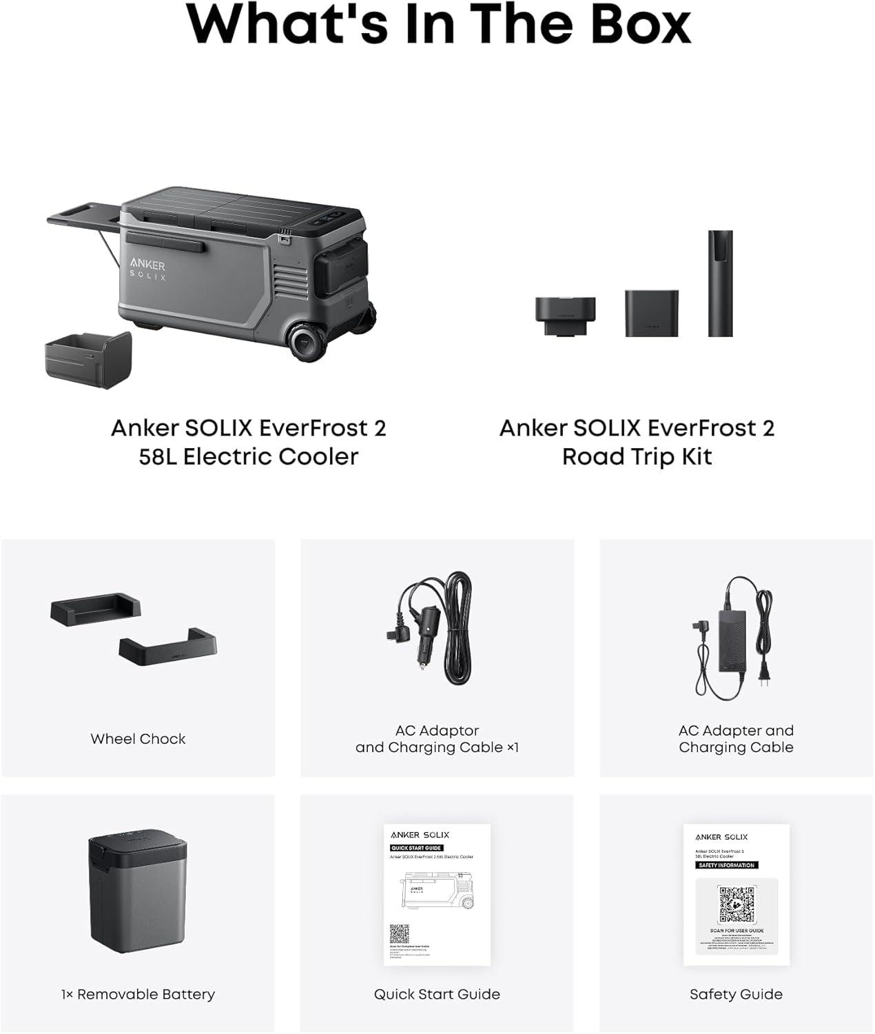 What's in the Box: Anker SOLIX EverFrost 2 Cooler, Road Trip Kit, Removable Battery, AC Adapter and Charging Cable, Car Charging Cable, Accessory Container, Wheel Chock, Safety, and Quick Start Guide.