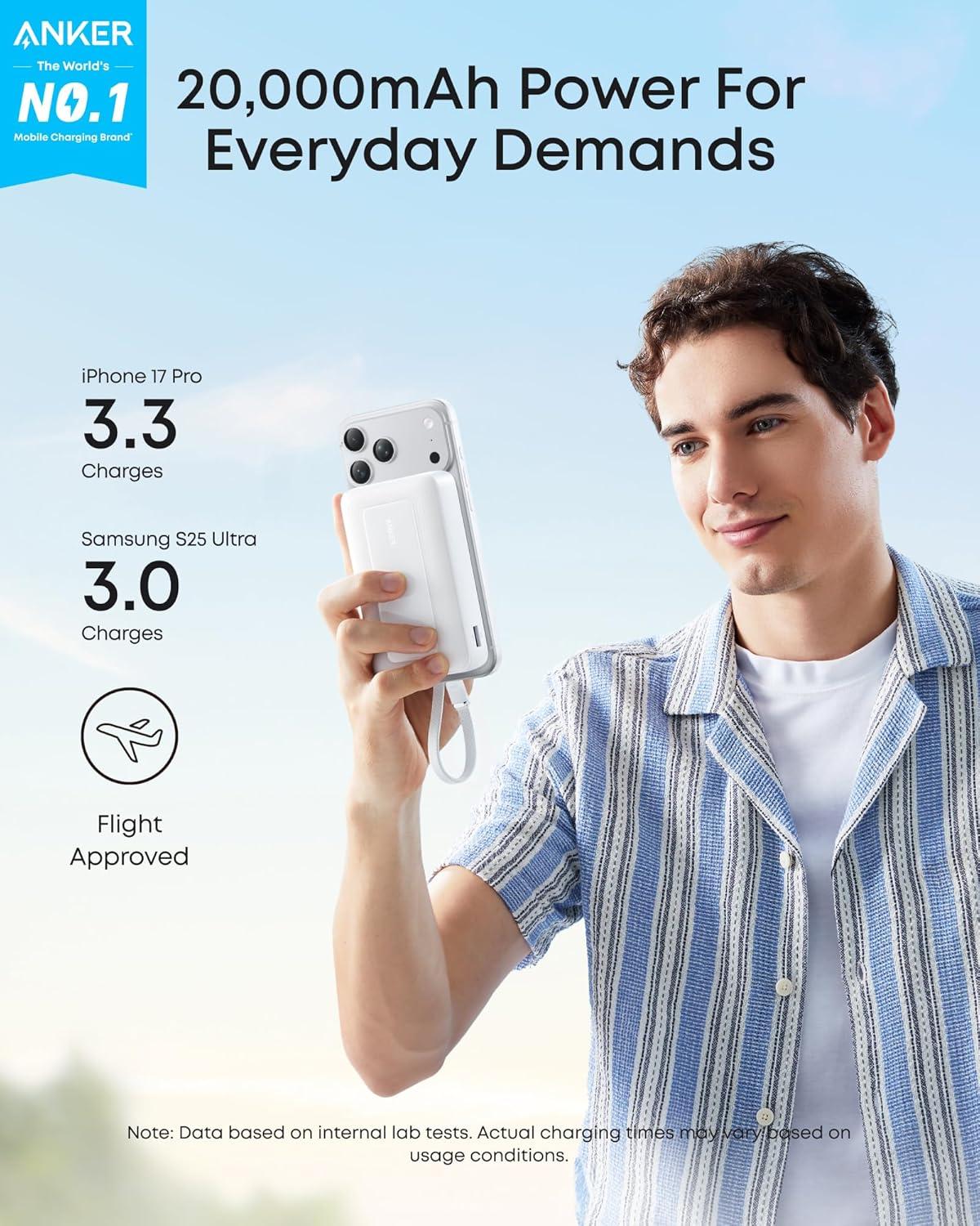 Anker Zolo Power Bank (2025 Upgraded Version), 45W Max Fast Charging, 20,000mAh Battery Pack, Dual Built-in USB-C Cables, USB-C&A Port, for iPhone 17/16 Series, Galaxy, MacBook, and More(White)